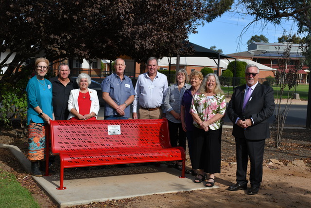 Members of the Port Pirie Domestic Violence Action Group at the unveiling of the Red Bench, from left Delia Guy, Peter and Jenny Lewis, Greg Clemow, Jack Keain, Ros Mayfield, Lyn Norton and Gail Carroll with Mayor Leon Stephens (Neralie Bailey: 476731_04)