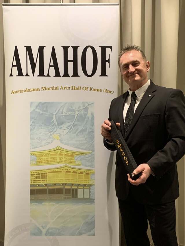 Port Pirie's Louie Dimou has recently returned from the Australasian Martial Arts Hall of Fame (AMAHOF) Gala, where he was awarded an official AMAHOF Black Belt. (Supplied)