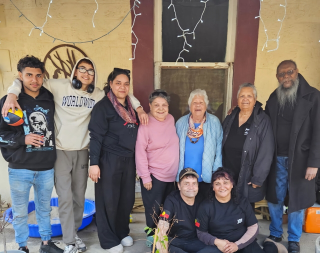 The Nungas in Koolunga event also marked a family reunion for many in the community, including Aunty Ros Weetra and Aunty Pat Waria-Read, Pauline Branson David 'Munge' Weetra, Uncle Vearle (Aunty Ros' partner), Joy Makepeace, David's children Lauren and Liam and grandson Zachary. (Supplied)