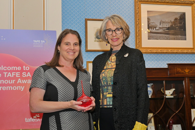 Vanessa Leigh, last year’s Regional Impact Award winner, receives her award from Adelaide Lord Mayor Dr Jane Lomax-Smith AM. (TAFE SA)
