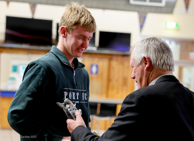 Brock Johanning receiving his leading goal kicker award for u18s from Les Promnitz at the 2025 Madigan Medal count (Victoria McLachlan: 502255_02)