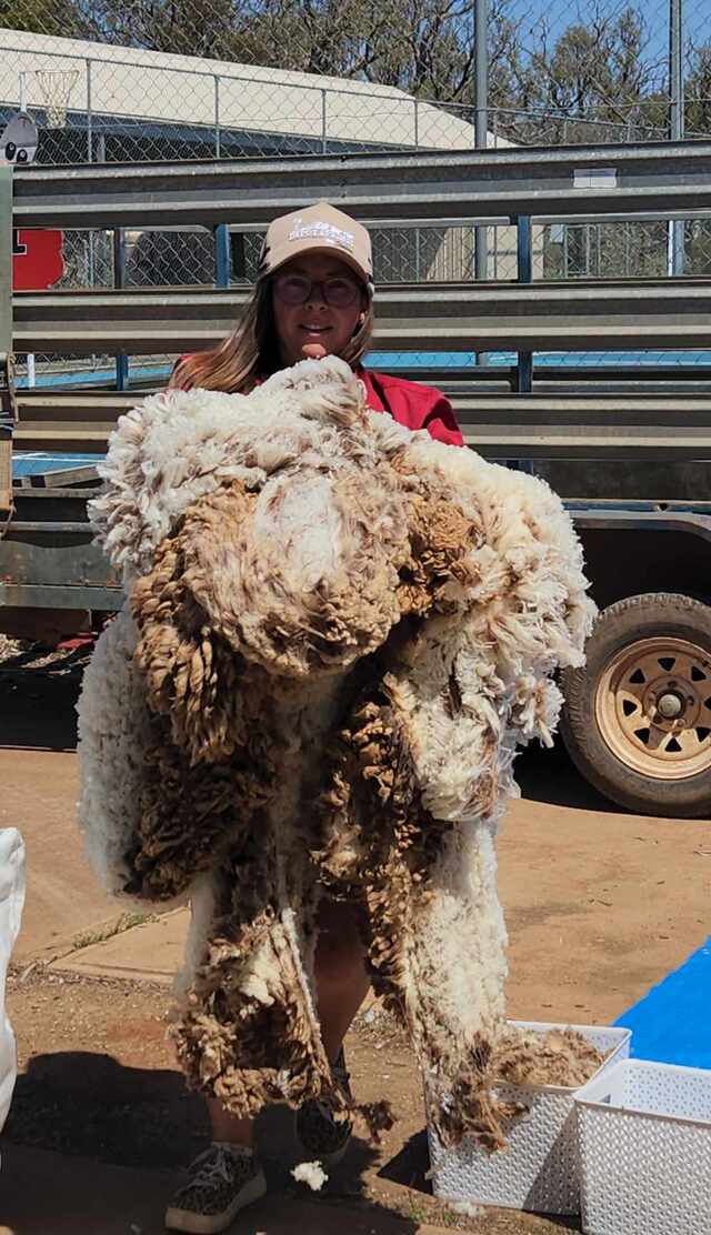 Aliah McDowell holding the fleece after shearing by YNOT Shearing. (supplied)