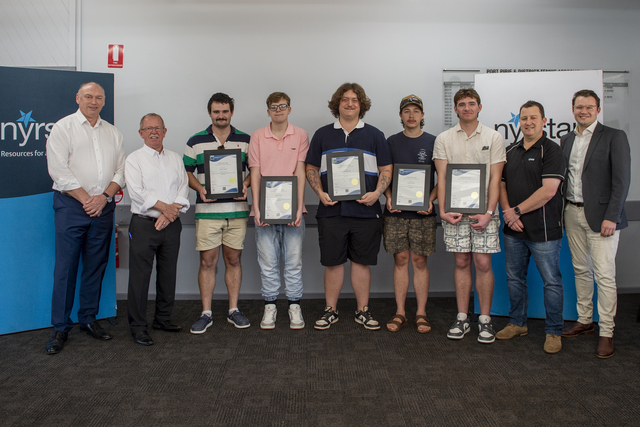 Attending the graduation was Nyrstar Port Pirie general manager Darin Cooper, Geoff Brock MP, Allan Fennell, Byron Grist, Chandler Warwick, Austin Harvey, Shannon McGregor, senior HR training coordinator Matt Adams, Tom Venning MP. Absent: Kurtis Rogers. (Kathy Gould Hip Photography) 519442_01