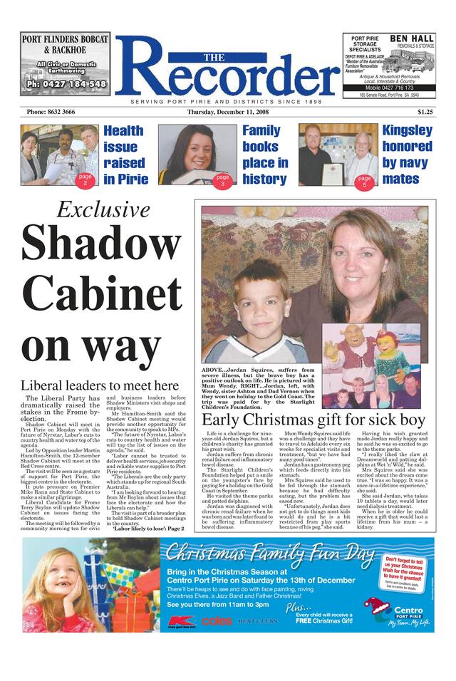 LOOKING BACK: Pt Pirie 08/12/2025 FacebookTwitterEmail THURSDAY, DECEMBER 11, 2008 SHADOW CABINET ON WAY The Liberal Party has dramatically raised the stakes in the Frome byelection. Shadow Cabinet will meet […] Subscribe or Login to see the rest of the content. Username Password * Remember Me Forgot Password
