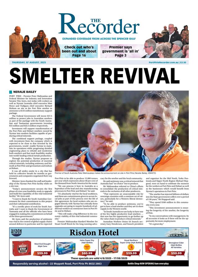 Year that was in Pt Pirie – August 29/12/2025 FacebookTwitterEmail AUGUST 08/08/25 - Premier Peter Malinaukas and Federal Minister Tim Ayres, met with workers and Nyrstar Australia chief executive Matt […] Subscribe or Login to see the rest of the content. Username Password * Remember Me Forgot Password