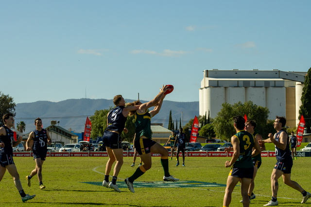 2025 Country Championships Football Saturday July 12 Southern v Central at Memorial Oval Port Pirie. Southern's Benjamin Heaslip attempts to spoil the mark (Jeanette Flynn: 489928_03)