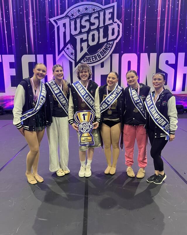 Bounce Beyond with coach Emily Turvey accepting their Grand Champion award, from left, Chloe Unger, Mayah Camporeale, Lachlan Pollard, Tanisha Rich, Lilly-Anne Brown and Emily Turvey (coach), absent Bree Kitschke (supplied)